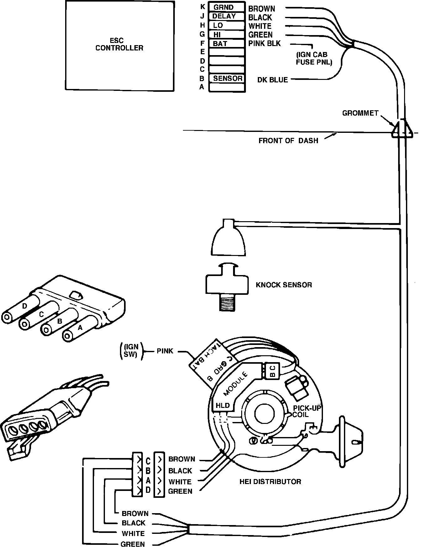 3. Remove jumper wire and reconnect connector to distributor. Turn on ignition, then measure voltage between pins F and K in the ESC controller 10 pin connector. If reading is less than 7 volts, check circuit between controller and ignition switch and repair as needed. If voltage is greater than 7 volts, proceed to next step.