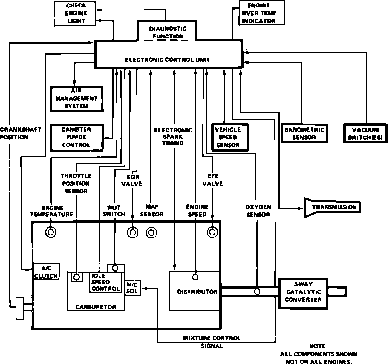 The Computer Command Control (C3) System is an electronically controlled emission system that can monitor as many as fifteen different engine/vehicle operating conditions, Fig. 1. The Electronic Control Module, (ECM), the control center of the C3 system, processes this information and signals commands to various engine performance related systems.