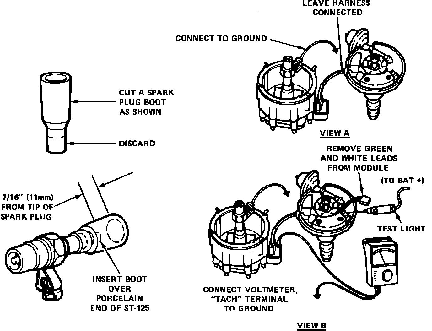 3. Never connect a wire directly between the Tach terminal of the distributor connector and ground as this will damage the electronic circuitry of the module.