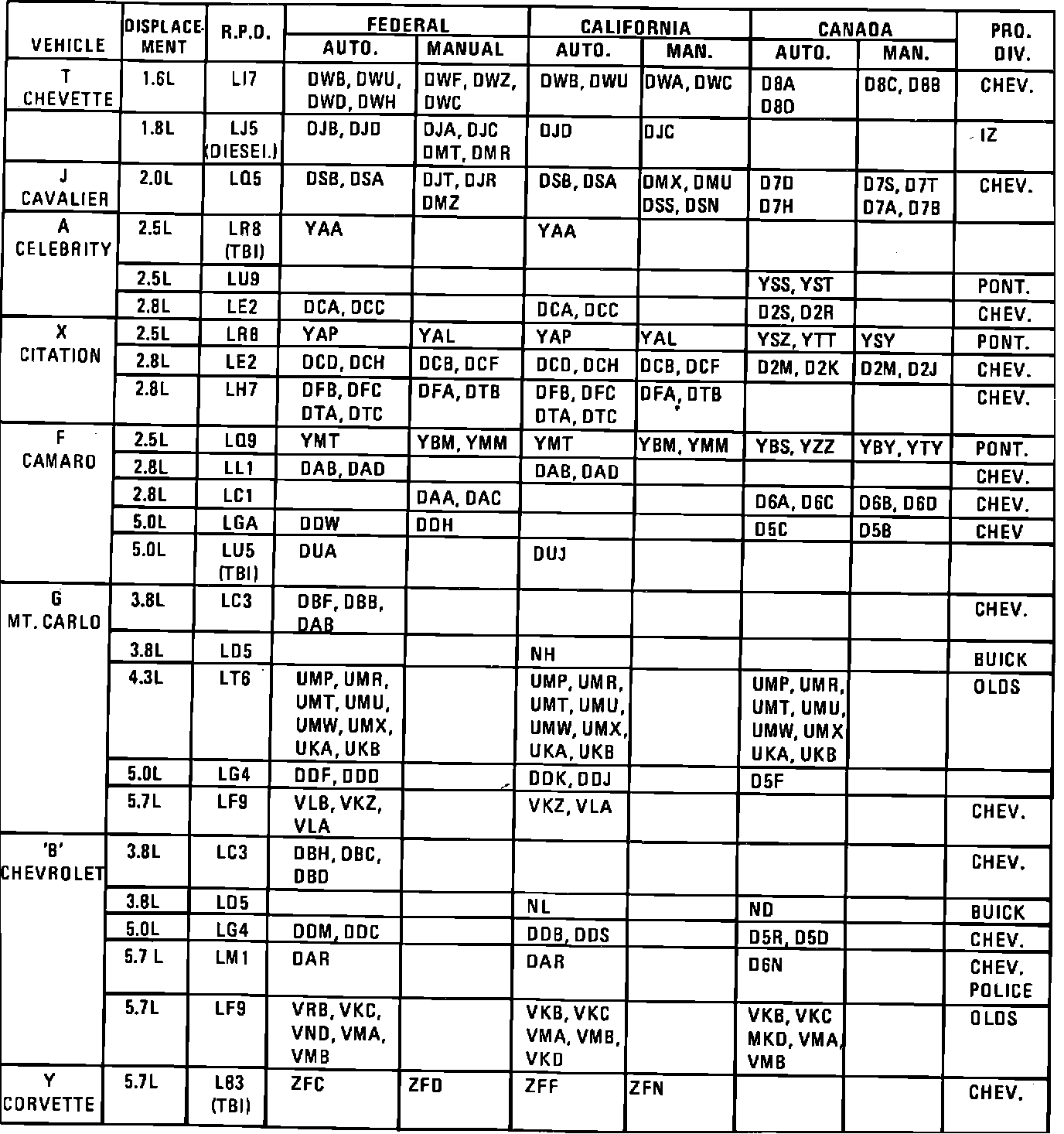 1983 PASSENGER ENGINE CODES