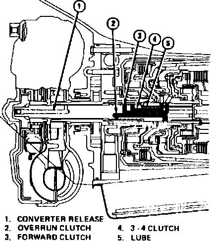Air blown into hole #1 will exit out the end of the turbine shaft around the checkball capsule. (Use care not to blow transmission fluid on your clothing or body.)