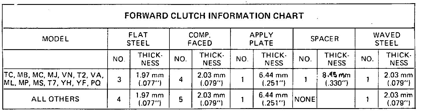 19. A forward clutch which requires five steel forward clutch plates will use a single thick apply plate. A forward clutch which requires four steel forward clutch plates will use a thin apply plate and thick spacer plate.