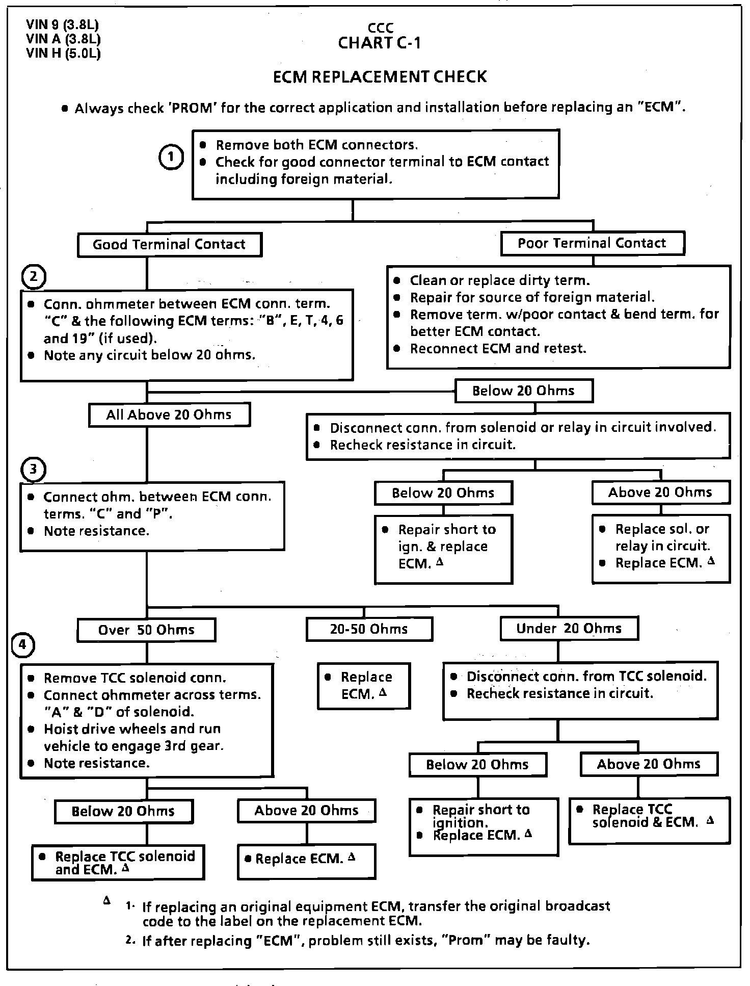 2. Checks for a short to ignition or shorted solenoid or relay. All terminals must be tested since several are connected internally in the ECM. A short in one circuit may cause another circuit in the ECM to be inoperative that does not have an external fault, but was the cause of "driver's complaint." Any circuit testing below 20 ohms is shorted to ignition, or shorted across the relay or solenoid.