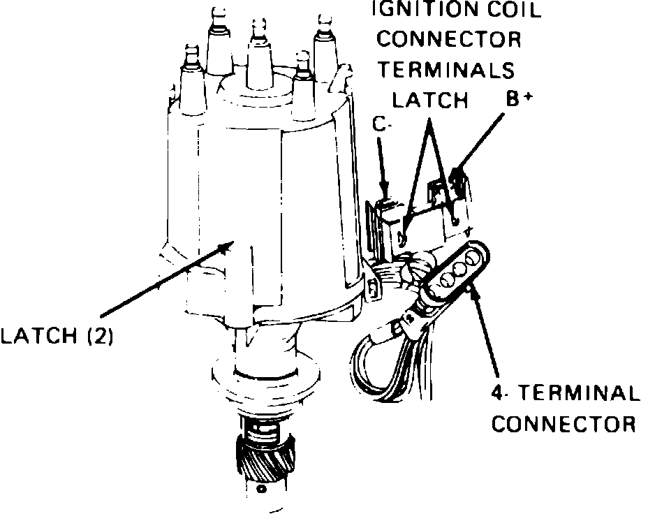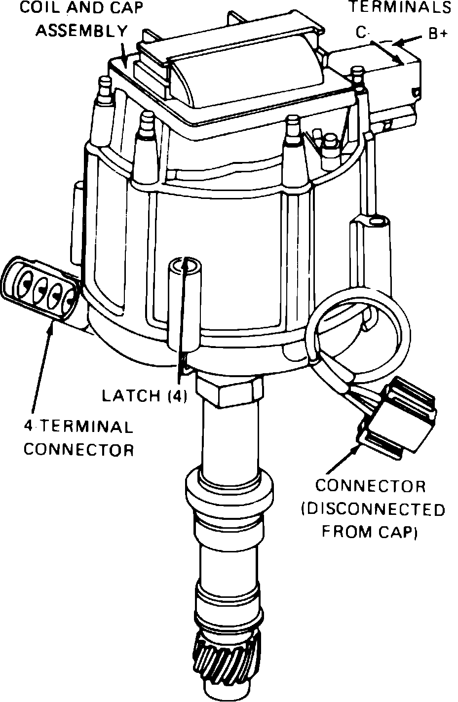 The HEI/EST is used on models with Computer Command Control (C-3) or Electronic Fuel Injection systems. The system utilizes a distributor similar to the unit used with conventional HEI systems that has been modified to allow spark advance to be controlled by the fuel control system Electronic Control Module (ECM). Modifications to the distributor include a revised ignition module, with additional terminals to receive signals from the ECM, and the elimination of the conventional centrifugal and vacuum advance mechanisms. In addition, some models use a Hall effect switch mounted above the pickup coil in the distributor to provide a reference pulse to the ECM. The ignition coil on HEI/EST systems is mounted either integral with the distributor, Fig. 1, or remotely mounted, Fig. 2, depending upon engine and application.