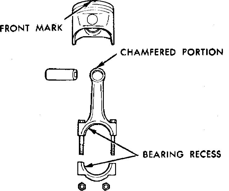 Assemble piston to rod so the mark on the piston is facing toward front of engine, Fig. 15, and the face of the connecting rod with the cylinder number mark is facing toward the starter side of the engine.