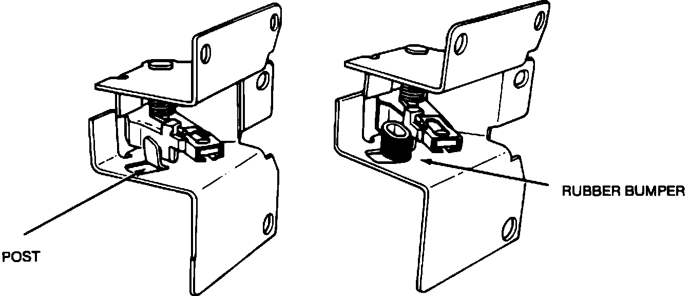 Some 1985-1986 C/K models and 1987 R/V models may have inside front and rear door handles that are misaligned. This misalignment may result in difficulty in getting fingers around the handle to release the latch. This condition is due to the rubber bumper shown in Figure No. 1 coming loose from the door handle bumper post. The rubber bumper may still be in the door handle assembly or it may have fallen inside the door. If the rubber bumper cannot be located or is damaged, a 3/8" piece of 1/4" I.D. x 1/2" O.D. rubber fuel line may be substituted.