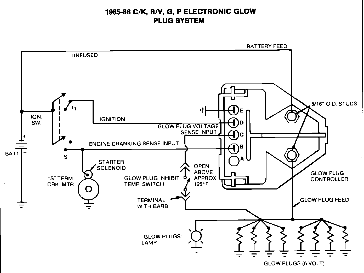 The 1985-88 6.2L diesel engine glow plug system consists of an integral-electronic controller glow plug relay assembly, 6-volt glow plugs, a glow plug light, and a glow plug inhibit temperature switch.