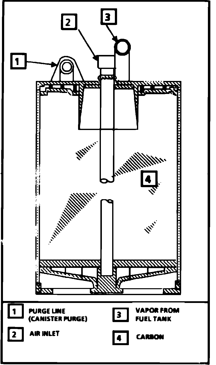 On models except high altitude, the canister, Fig. 69, is purged whenever the engine is operating at speeds above idle. A timed vacuum source is applied to the canister vapor tube, drawing fresh air into the canister through the air inlet located at the top of the canister. The fresh air flows through the tube to the bottom of the canister, forcing fuel vapors out through the purge line.