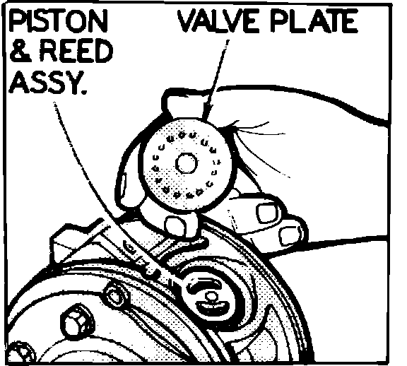 Clutch plate and hub assembly, clutch rotor and bearing assembly, and clutch coil and pulley rim must be removed in order to remove compressor shell. Compressor should be at room temperature to ease removal of steel shell from aluminum cylinder, which expands at greater rate than shell.