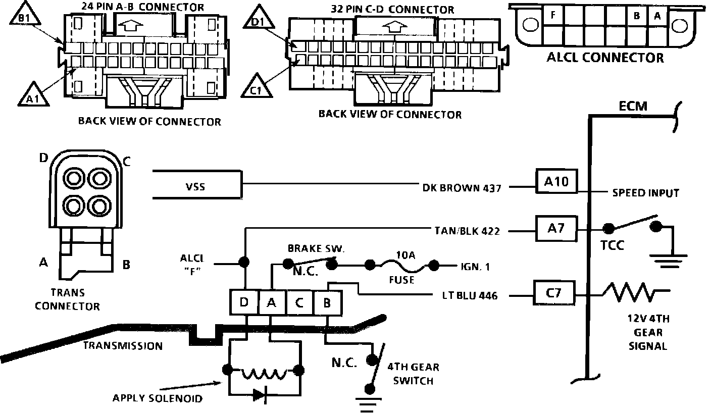 Fused battery ignition is supplied to the TCC solenoid through the brake switch. The ECM will engage TCC by grounding CKT 422 to energize the solenoid.