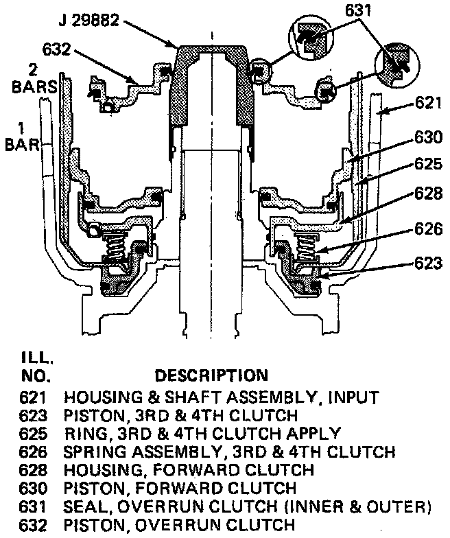 24. Install overrun clutch piston with hub facing upward. If all parts are properly seated at this point, the overrun piston hub will be approximately 3/16 inch below the snap ring groove in the input housing hub.
