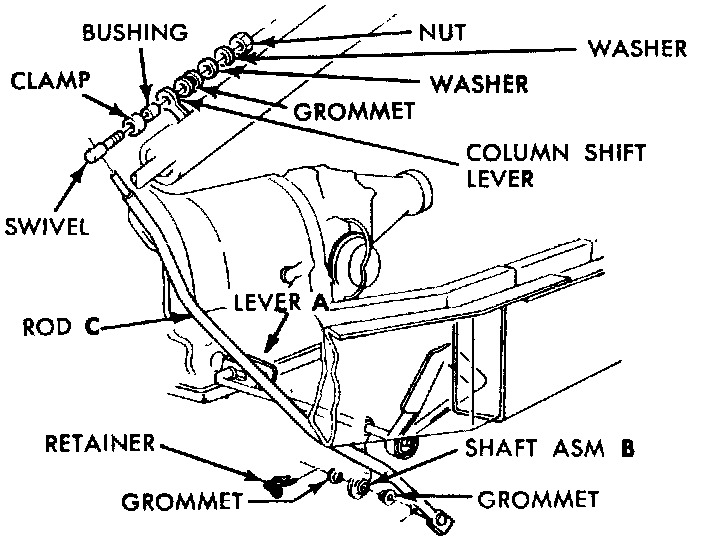 4. Slide swivel and clamp onto rod (C), then attach to column shift lever.