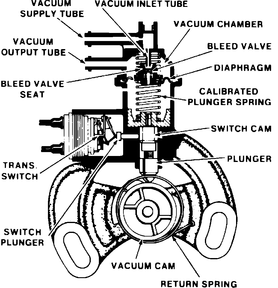 4. Open throttle while observing vacuum gauge and ohmmeter. Meter should indicate continuity with vacuum reading above 12 inches Hg and infinite resistance with vacuum reading below 12 inches Hg.