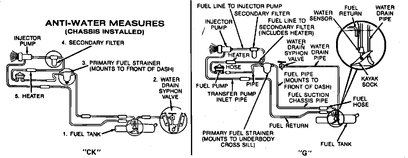 Fuel is drawn from the tank by the camshaft drive mechanical mechanical pump. Fuel is then pumped through the fuel filter and heater assembly mounted on the front of the dash on C, K, R and V models or under the air cleaner on G and P models. In the filter, contaminants are strained out of the fuel, water is separated and the fuel is heated to prevent formation of wax deposits. From the filter fuel is delivered to the high pressure rotary vane type injection pump. The injection pump meters and pressurizes the fuel, then directs it through the injector lines to the injector nozzles. The eight high pressure injector lines are all of equal length, although their shapes may be different, in order to prevent any difference in injection timing between cylinders.