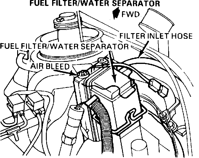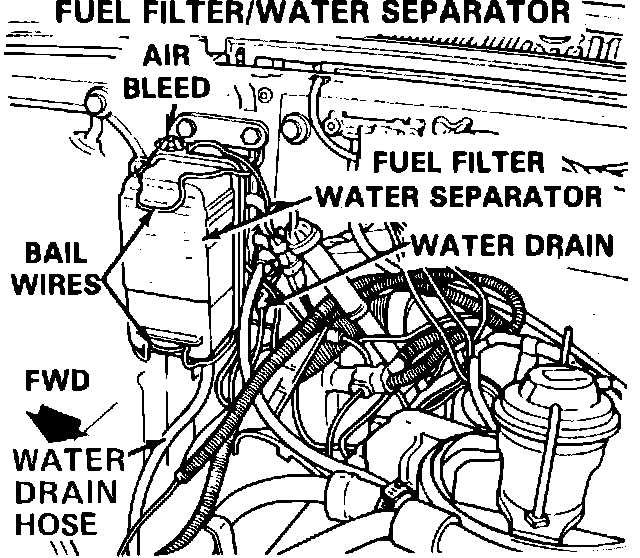 The water separation system on these models is incorporated into the fuel filter assembly, Figs. 3 and 4. The fuel filter separates and traps water contained in the fuel, and when the water level reaches a point where it could be drawn into the system, the ``WATER IN FUEL'' lamp on the instrument panel is illuminated. In addition, the low pressure sensor on the filter outlet will also illuminate the lamp if the fuel filter becomes clogged.