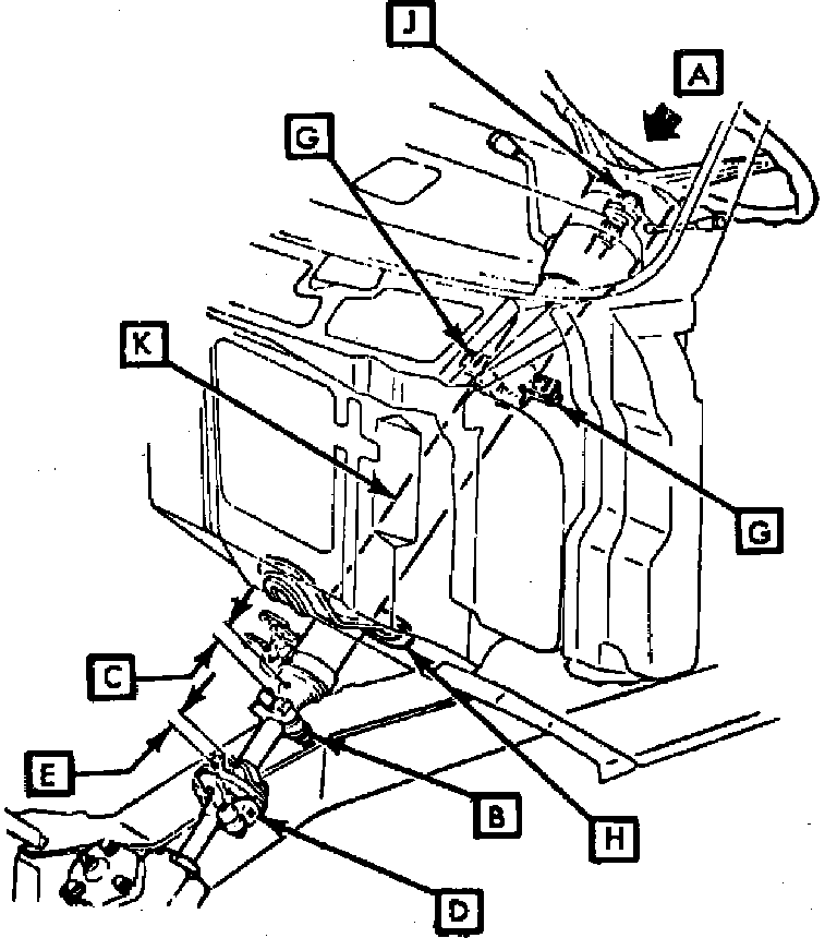 4. All steering column jacket clamps must be torqued to 30 lb ft Threaded portion of steering shaft (J) must be completely free of lubricant, after steering column jacket (K) is installed to maintain steering wheel clamping load and hub clearance.