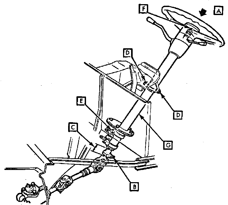 3. All steering column jacket clamps must be tightened to specification. Threaded portion of steering shaft (F) must be completely free of lubricant, after steering column jacket (G) is installed, to maintain steering wheel clamping load and hub clearance.