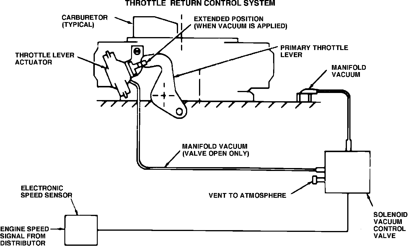 This system, Fig. 86, is used on some vehicles. During coasting, the control valve opens to allow vacuum to operate the throttle lever actuator. The throttle actuator lever holds the throttle valve slightly open, thereby allowing more air to enter the combustion chambers to lean out the over-rich mixture and reduce hydrocarbon emissions. When manifold vacuum drops below a predetermined value, the control valve closes, allowing the throttle actuator to return the throttle valve to normal idle.