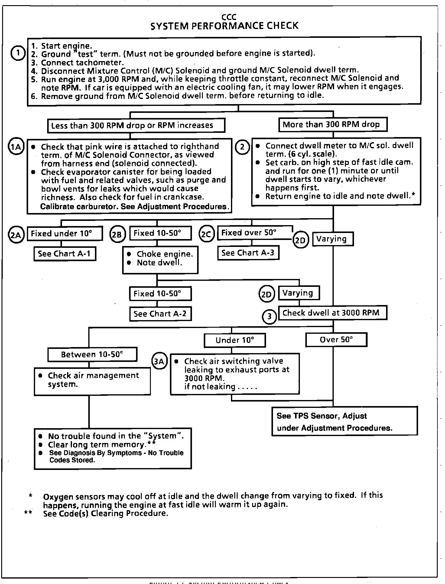1. Checks for ability of carburetor main metering system to change the Air/Fuel mixture. Disconnecting M/C solenoid makes carburetor operate full-rich and reconnecting it with the dwell lead grounded makes it operate full-lean. Normal response - RPM drops as M/C solenoid is reconnected. Usually 400-1000 RPM, but should be at least 300 RPM.