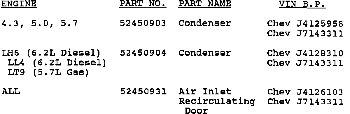 52450904 condenser replaces 3057628 condenser on LH6 engines (diesel 8 cylinder, 6.2L); LL4 engines (diesel 8 cylinder 6.2L heavy duty); and LT9 engines (gas V8 heavy duty 5.7L) (350).