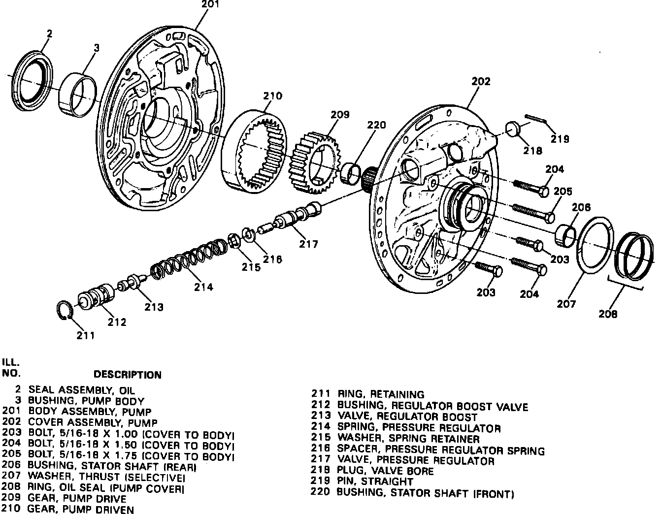 Some THM 400/475 models may experience a fluid leak coming from the converter or oil pump area. This could be caused by the front pump bushing walking forward, resulting in fluid being forced past the pump oil seal. A new bushing was introduced that has an increased hardness specification which results in a higher push-out load.
