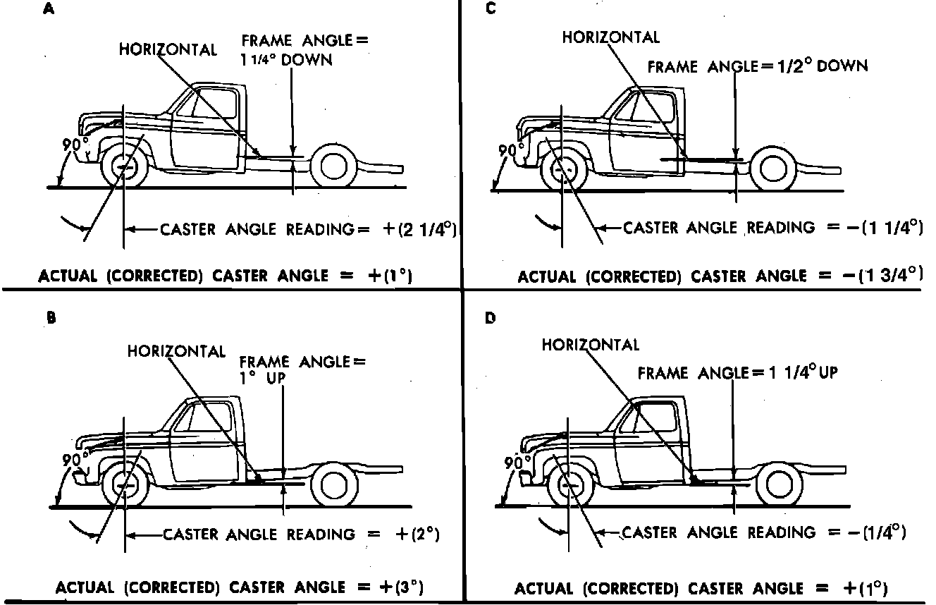3. Using frame angle measurement and measured caster angle, determine actual (corrected) caster angle as follows: