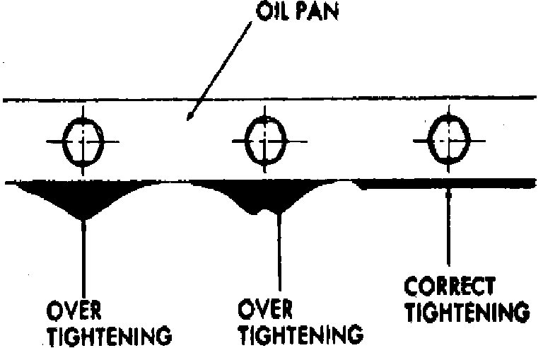 3. Install nuts and bolts and torque evenly to 4 ft. lbs.Check edge of gasket to check proper positioning. If projection of gasket edge beyond the oil pan flange is uneven, remove and reinstall, Fig. 17.