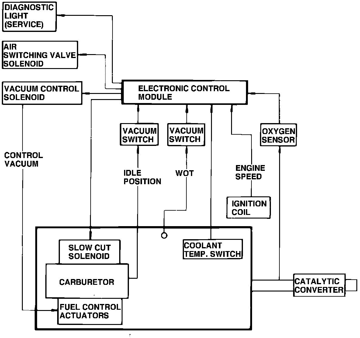 The Closed Loop Fuel Control System, Fig. 1, is used on S/T Series California models with 4-119 engine. The system is used to provide precise control of the air/fuel mixtures, allowing use of a dual bed 3-way catalytic converter and to control air flow in the AIR system. System components include an electronic Control Module (ECM), oxygen sensor, vacuum fuel control valve and duty solenoid, electronically controlled carburetor and other sensors and actuators. The three-way catalytic converter is also considered part of this system.