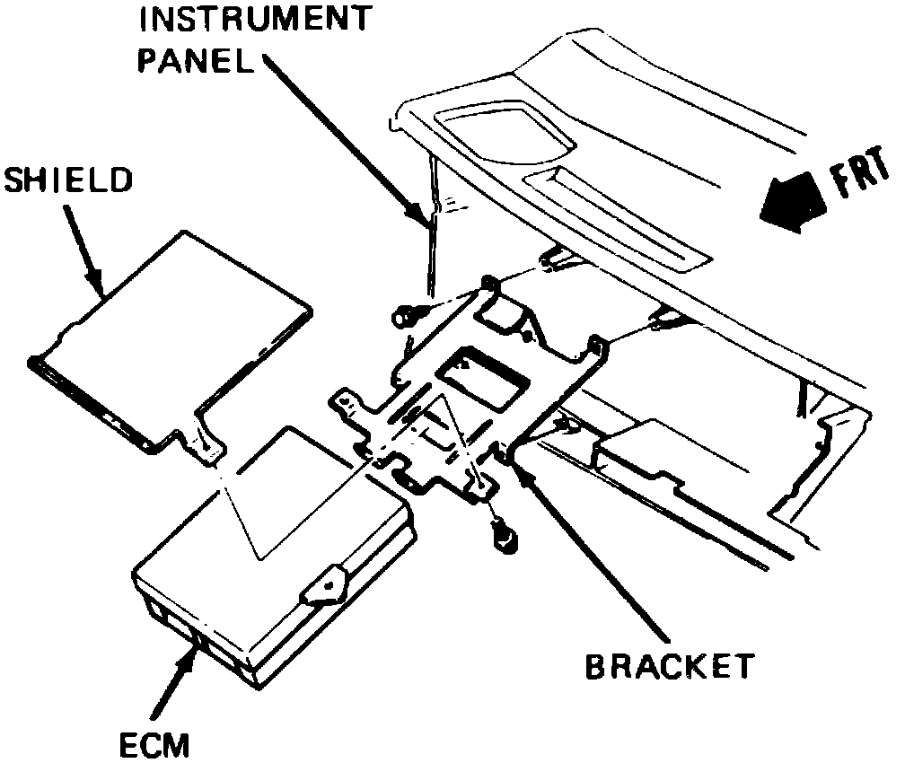 1. Remove ECM attaching screws, shield and bracket from instrument panel, then disconnect electrical connector and remove ECM, Fig. 39.