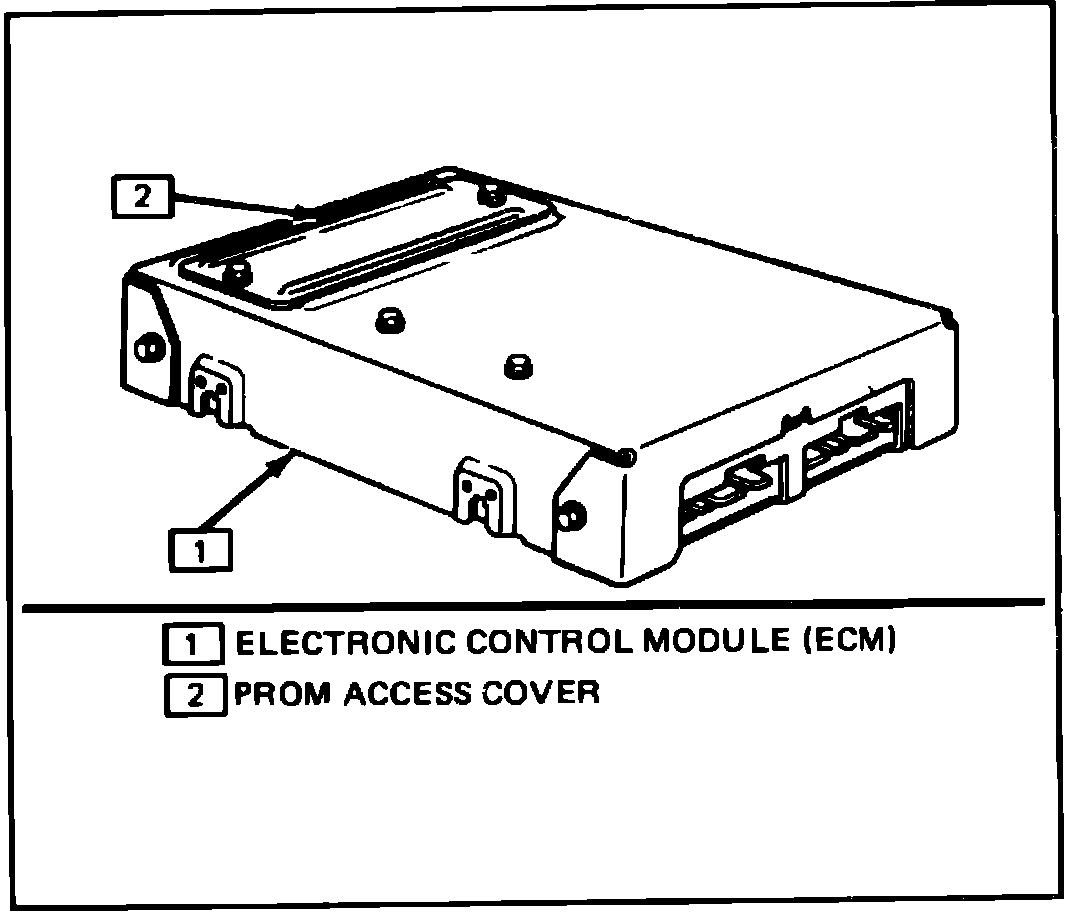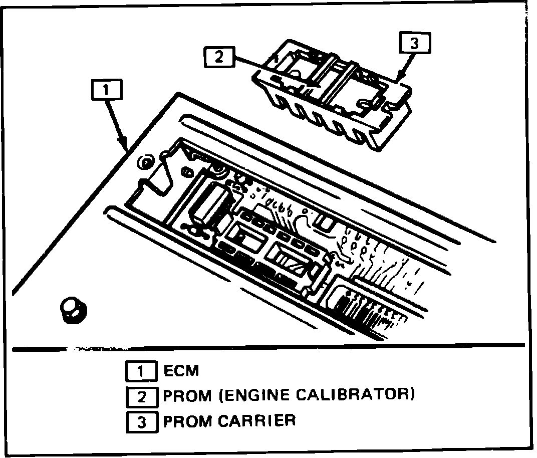 The DEC system is used on 1984-85 California light duty emissions and all 1988 V8-379 engines. The ECM, Fig. 1, is located in the passenger compartment and is the control center of the DEC system. The ECM monitors input information from various sensors and controls the EGR and TCC systems. On 1988 models, the ECM also controls the Cold Advance/Glow Plug system. A removable calibration unit called a PROM (programable Read Out Memory), Fig. 2, tailors ECM operation to the the vehicle application by providing the memory data used to perform calculations. In addition the ECM provides diagnostic logic which detects faults in the systems that the ECM monitors or controls. On 1988 models, the ECM will illuminate a Service Engine Soon lamp on the instrument panel when a malfunctions in the sensor or control circuits is encountered. On 1984-85 models, there is no Service Engine Soon lamp on the instrument panel, therefore the Diesel Diagnostic Check Tool, which is equipped with a Check Engine light, must be used. On 1984 models, the ECM will not store flash codes. On 1985 and 1988 models, the ECM will store a code or codes which will identify the problem area. These codes can be read through the ALDL. The ECM will not store the code once the problem has been corrected. Therefore, intermittent malfunctions will only be signaled when the problem is present. The ECM must be maintained at a temperature below 185°F, otherwise the ECM may become inoperative.