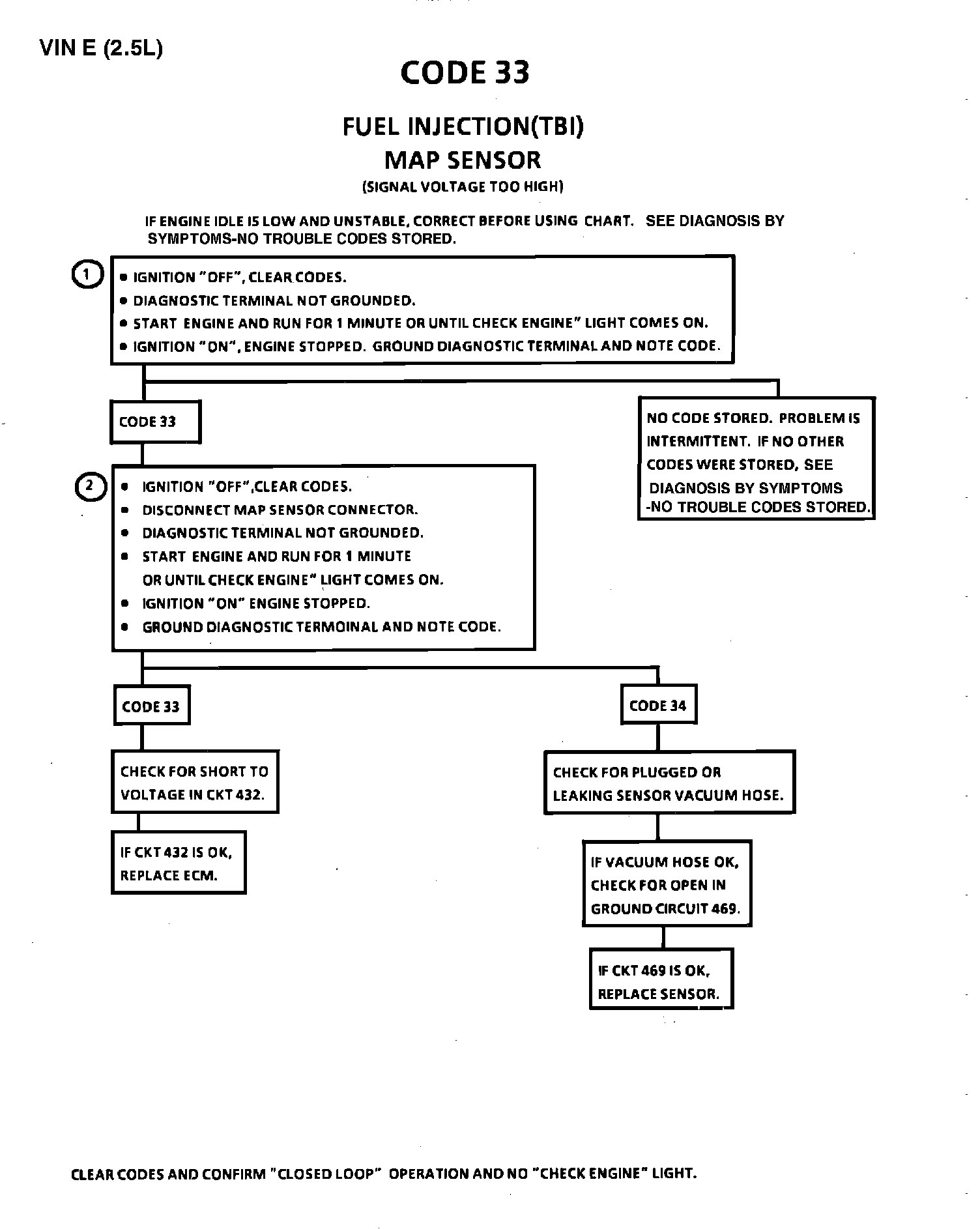 Engine misfire or a low and unstable idle may set Code 33. Disconnect MAP sensor and system will go into backup mode. If the misfire or idle condition remains, see Diagnosis By Symptoms.