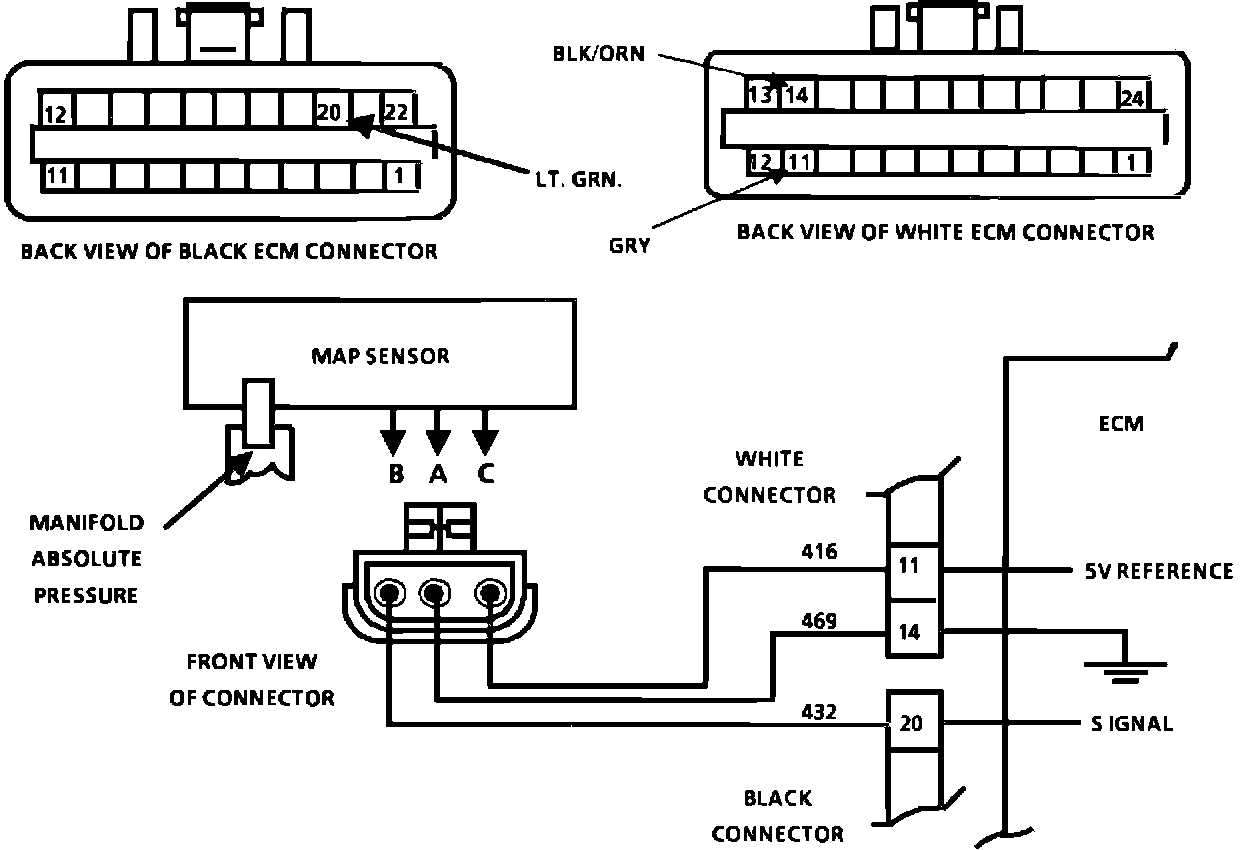 The Manifold Absolute Pressure sensor (MAP) responds to changes in manifold pressure (vacuum). The ECM receives this information as a signal voltage that will vary from about 1 to 1-1/2 volts at idle to 4-4.5 volts at wide open throttle.