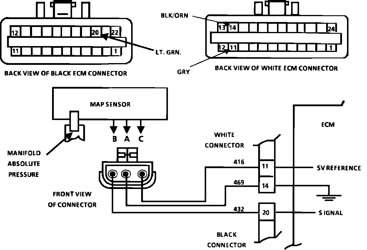 The Manifold Absolute Pressure sensor (MAP) responds to changes in manifold pressure (vacuum). The ECM receives this information as a signal voltage that will vary from about 1 to 1-1/2 volts at idle to 4-4.5 volts at wide open throttle.