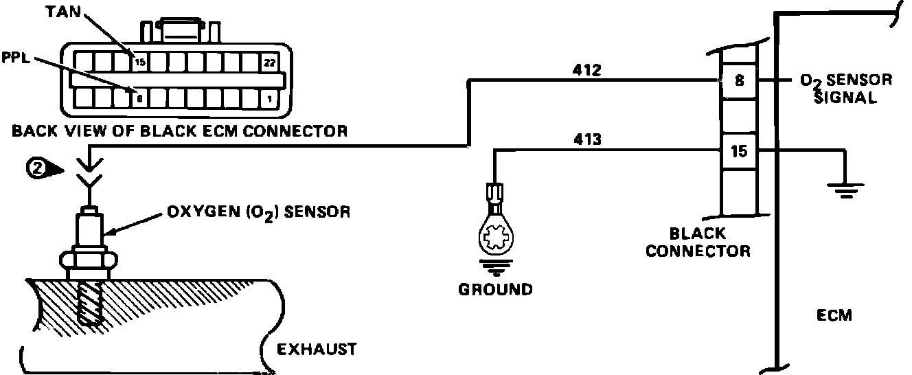 The ECM supplies a voltage of about .45 volt between terminals "8" and "15". (If measured with a 10 megohm digital voltmeter, this may read as low as .32 volts.) The O2 sensor varies the voltage within a range of about 1 volt if the exhaust is rich, down through about .10 volt if exhaust is lean.