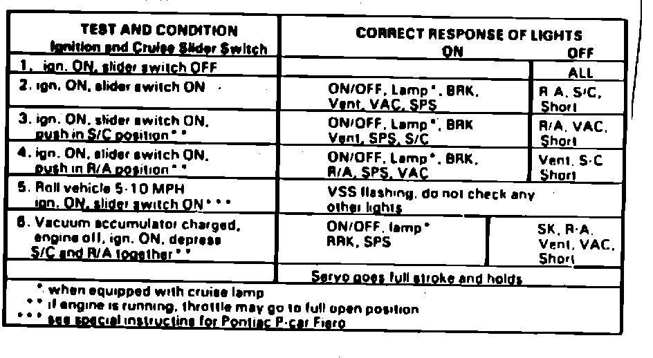 The existing diagnostic test procedure listed on the reverse side of these "Quick Checkers" includes five troubleshooting steps. Each step provides a reliable indication--by the illumination of a light--of the electrical continuity of specific components in the cruise control system. A large number of GM Dealership service personnel are under the misunderstanding that these same five steps, also, verify the condition of the cruise vacuum system. This is not the case. To clear up this mistaken assumption, an essential addition has been incorporated in the existing test procedure: