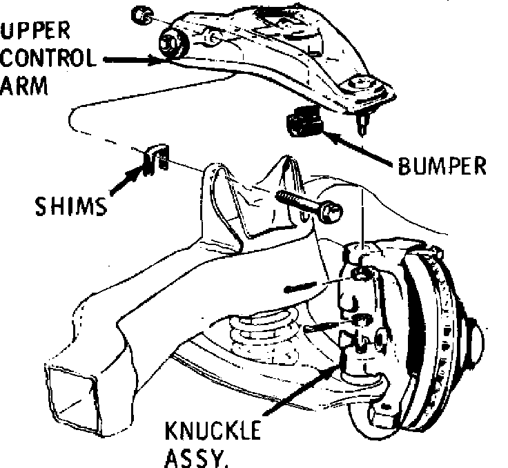 1. Remove retaining nuts and shims from control arm, Fig. 5. Note location of shims for assembly reference.