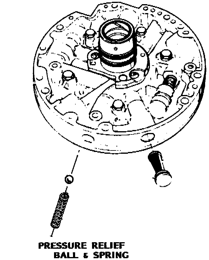 Examine the pressure relief check ball and spring (see figure) This check ball controls excessive mainline oil pressure. If the transmission has extremely high pressure due to a stuck, or wrong pressure regulation valve, the pressure relief ball should prevent mainline oil pressure from exceeding approximately 400 P.S.I. If this ball is stuck off its seat, or has foreign material preventing its proper seating, mainline pressure will exhaust into the sump