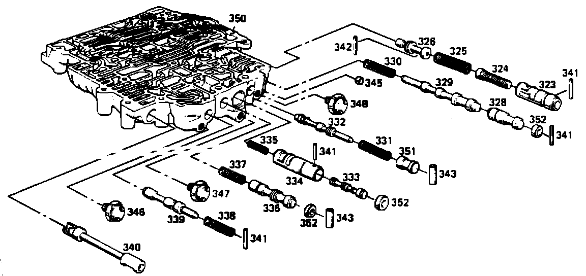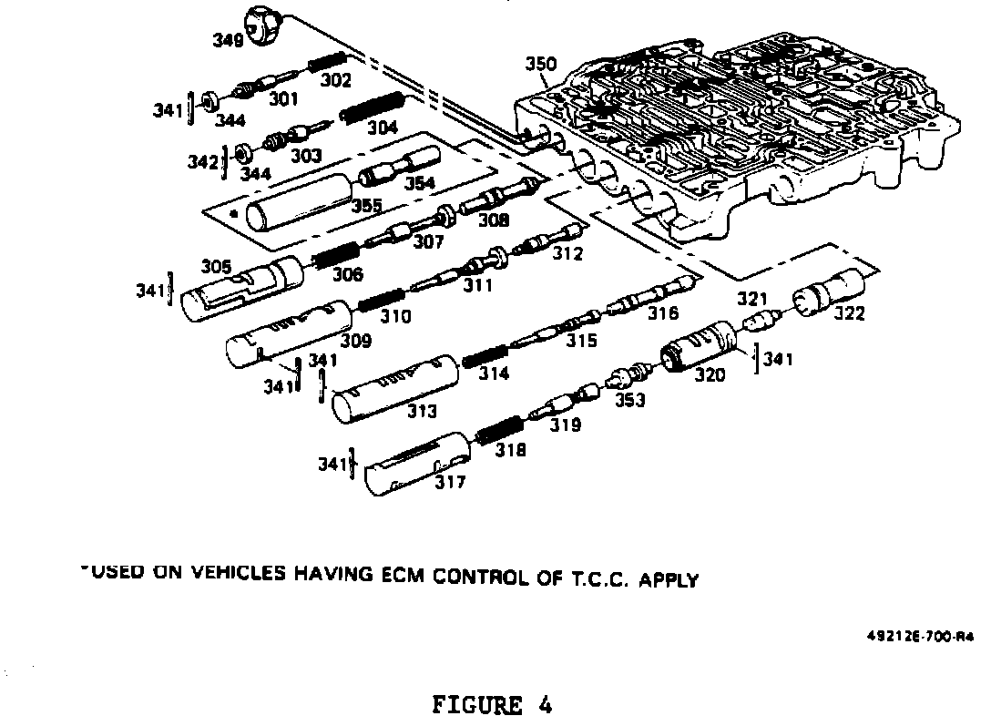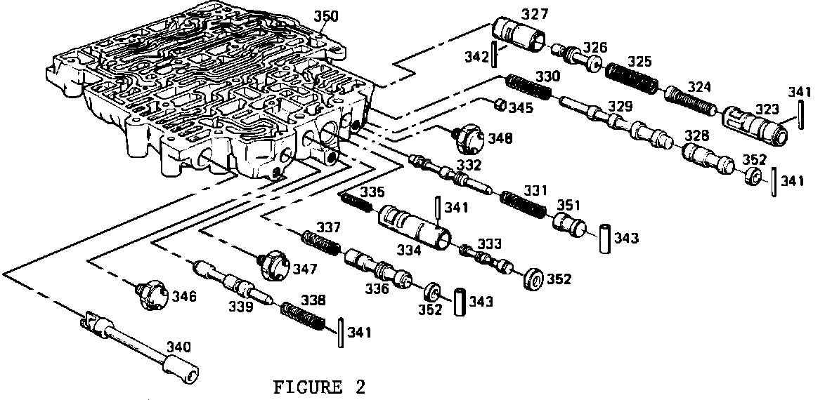 301 VALVE, T.V. MODULATOR DOWNSHIFT 302 SPRING, T.V. MODULATOR DOWNSHIFT VALVE 303 VALVE, T.V. MODULATOR UPSHIFT 304 SPRING, T.V. MODULATOR UPSHIFT VALVE 305 SLEEVE, CONVERTER CLUTCH THROTTLE 306 SPRING, CONVERTER CLUTCH THROTTLE 307 VALVE, CONVERTER CLUTCH THROTTLE 308 VALVE, CONVERTER CLUTCH SHIFT 309 SLEEVE, 3-4 THROTTLE VALVE 310 SPRING, 3-4 THROTTLE VALVE 311 VALVE, 3-4 THROTTLE 312 VALVE, 3-4 SHIFT 313 SLEEVE, 2-3 THROTTLE VALVE 314 SPRING, 2-3 THROTTLE VALVE 315 VALVE, 2-3 THROTTLE 316 VALVE, 2-3 SHIFT 317 SLEEVE, 1-2 THROTTLE VALVE 318 SPRING, 1-2 THROTTLE VALVE 319 VALVE, 1-2 THROTTLE 320 SLEEVE, LO RANGE CONTROL 321 VALVE, 1-2 LO RANGE DOWNSHIFT 322 VALVE, 1-2 SHIFT 323 SLEEVE, THROTTLE VALVE PLUNGER 324 PLUNGER THROTTLE VALVE 325 SPRING, THROTTLE VALVE 326 VALVE, THROTTLE 328 VALVE, 3-4 RELAY 329 VALVE, 4-3 SEQUENCE 330 SPRING, 4-3 SEQUENCE VALVE 331 SPRING, T.V. LIMIT VALVE 332 VALVE, T.V. LIMIT 333 VALVE, 1-2 ACCUMULATOR 334 SLEEVE, 1-2 ACCUMULATOR VALVE 335 SPRING, 1-2 ACCUMULATOR VALVE 336 VALVE, LINE BIAS 337 SPRING, LINE BIAS VALVE 338 SPRING, 3-2 CONTROL 339 VALVE, 3-2 CONTROL 340 VALVE, MANUAL 341 PIN, COILED SPRING 342 PIN, COILED SPRING 343 RETAINER, SPRING (SLEEVE) 344 PLUG, VALVE BORE 345 PLUG, CUP (.33 DIA.) 346 SWITCH ASM., PRESSURE (3RD CLUTCH) 347 SWITCH ASM., PRESSURE (4-3 PULSE) 348 SWITCH ASM., PRESSURE (4TH CLUTCH) 349 SWITCH ASM., PRESSURE (T.C.C. SIGNAL) 350 BODY, CONTROL VALVE 351 PLUG, T.V. LIMIT 352 PLUG, VALVE BORE (12.5 - O.D.) 353 VALVE, 1-2 LO RANGE UPSHIFT 354 PLUG, CONVERTER CLUTCH SHIFT VALVE BORE (ECM CONTROLLED VEHICLES) 355 PLUG, CONVERTER CLUTCH T.V. BUSHING BORE (ECM CONTROLLED VEHICLES)