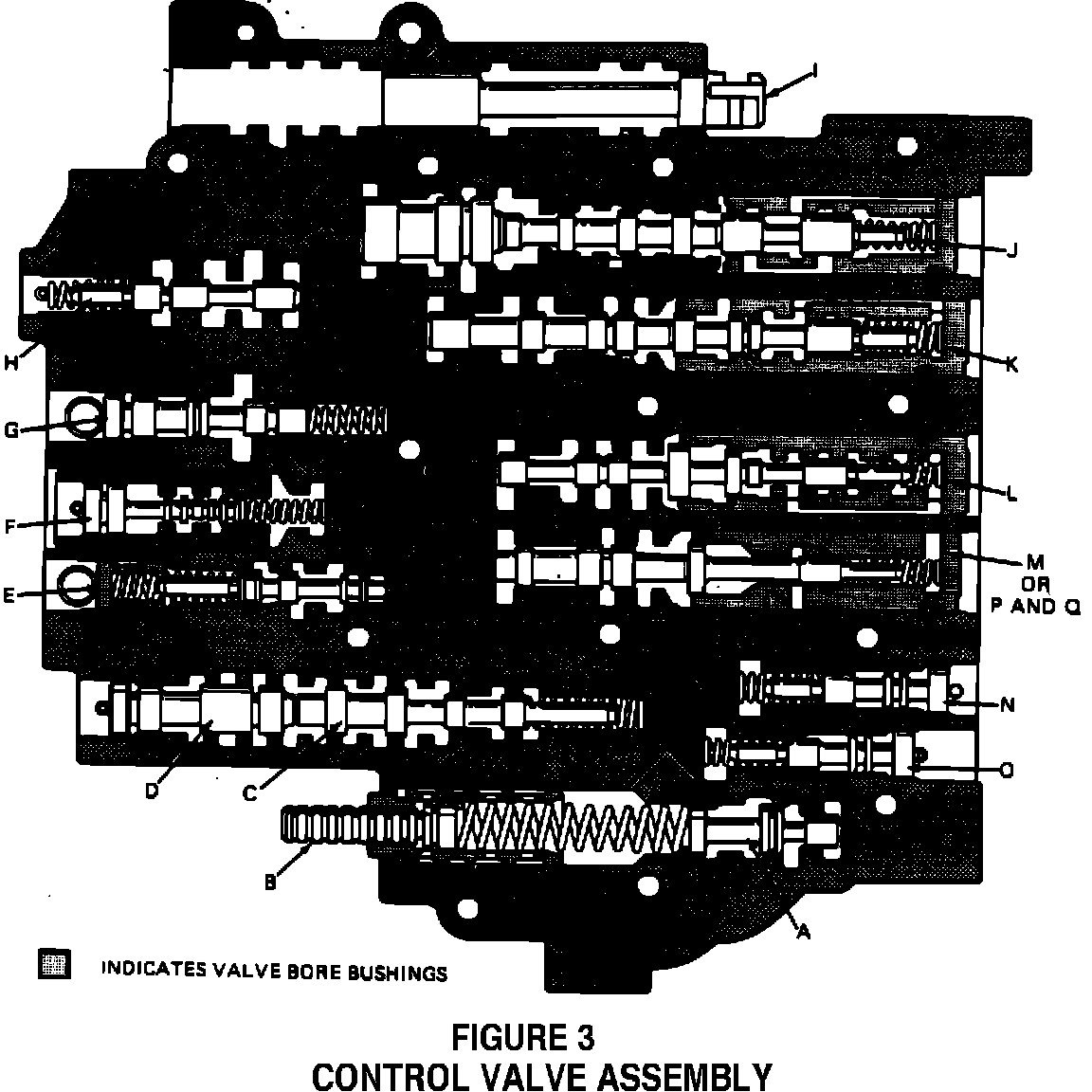 K 2-3 SHIFT VALVE TRAIN L 3-4 SHIFT VALVE TRAIN N M.T.V. UP VALVE TRAIN M CONVERTER CLUTCH SHIFT VALVE TRAIN O M.T.V. DOWN VALVE TRAIN P CONVERTER CLUTCH T.V. BUSHING BORE PLUG (ECM CONTROLLED VEHICLES) Q CONVERTER CLUTCH SHIFT VALVE BORE PLUG (ECM CONTROLLED VEHICLES)