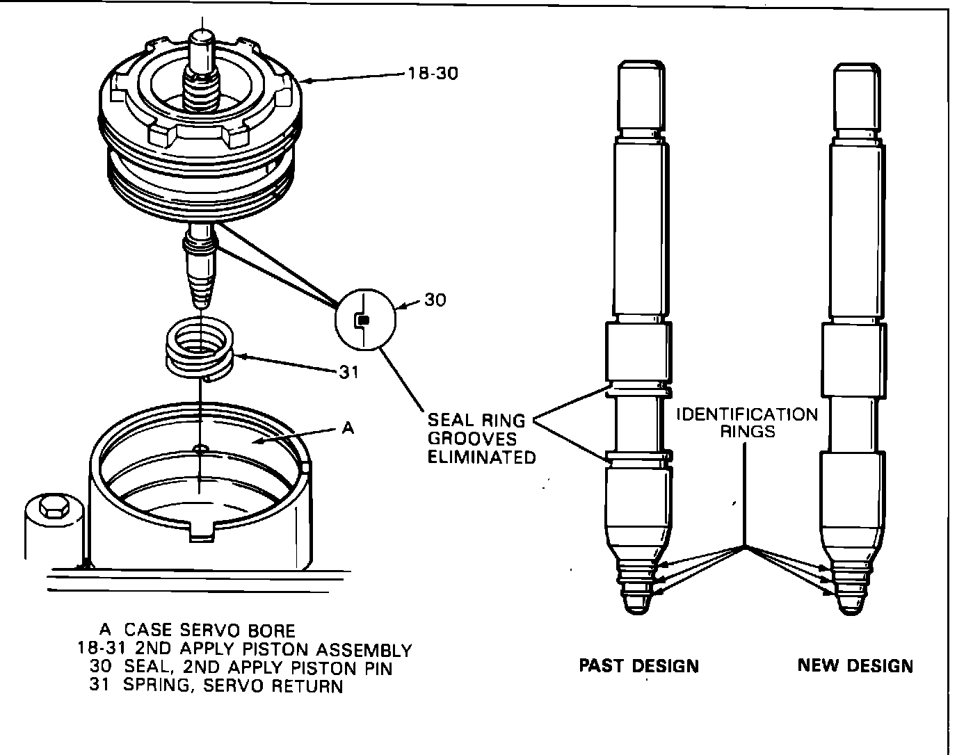 This bulletin covers changes to the second servo apply pin that eliminated the two ring seals. This change reduces the potential for seal damage during assembly. Testing has shown that any potential leakage in this area with the new design pin will not affect transmission performance.