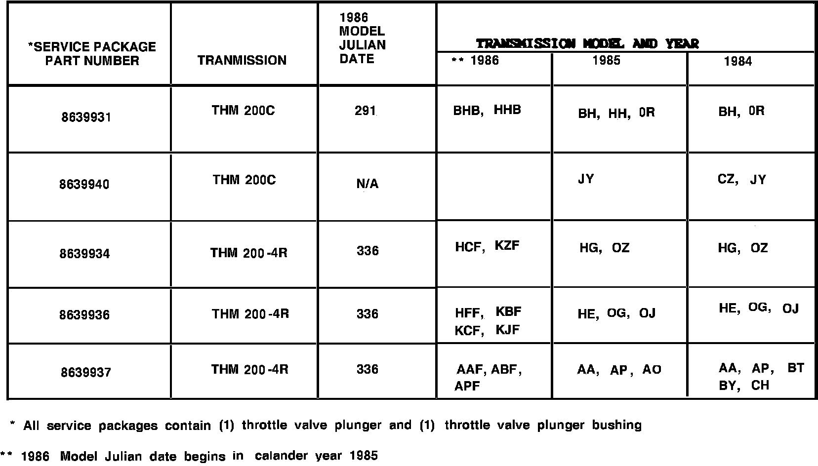To repair this condition, a new throttle valve plunger and throttle valve bushing should be installed. Refer to Figures 1 and 2 for transmission nameplate identification information and to Figures 3 and 4 for service parts indentification. The chart provided indicates service package part numbers, transmission model applications and 1986 model start of production Julian dates for the THM 200C and 200-4R transmissions.