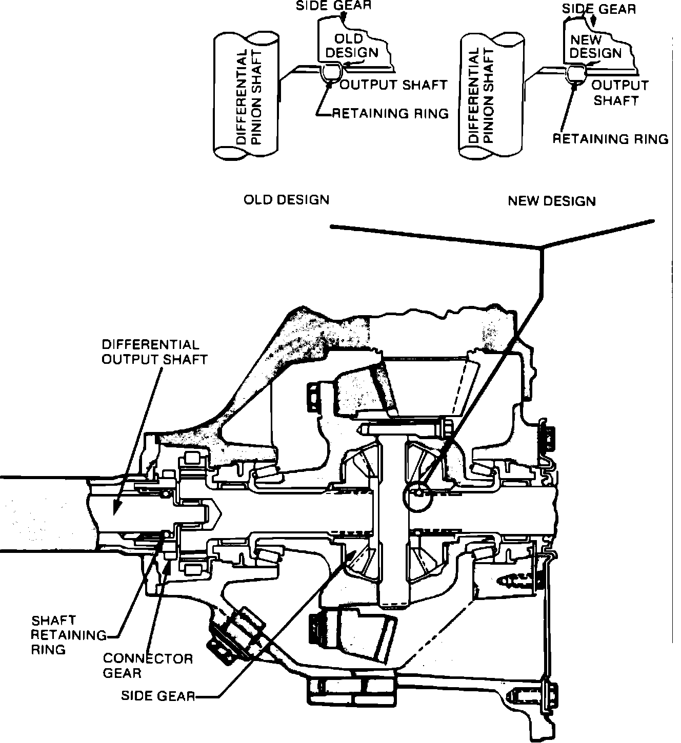 During the 1985 model year, a design change to the front driving axle assembly was made to the improve axle output shaft retention. The modification, in the shape of the differential side gear is shown in Figure No. 1.