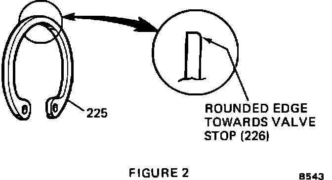 ^ Not properly seated or missing retaining ring (item 225). When installing this retaining ring make certain the rounded edge of the ring faces the valve stop (item 226). Refer to Figure 2.