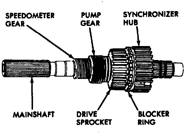 3. Install thrust washer, drive sprocket, blocker ring and synchronizer hub on mainshaft.