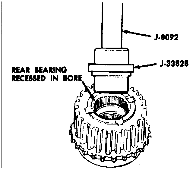 1. Install front drive sprocket bearing using tools J-33828 and J-8092 until tool bottoms out and bearing is flush with front surface.