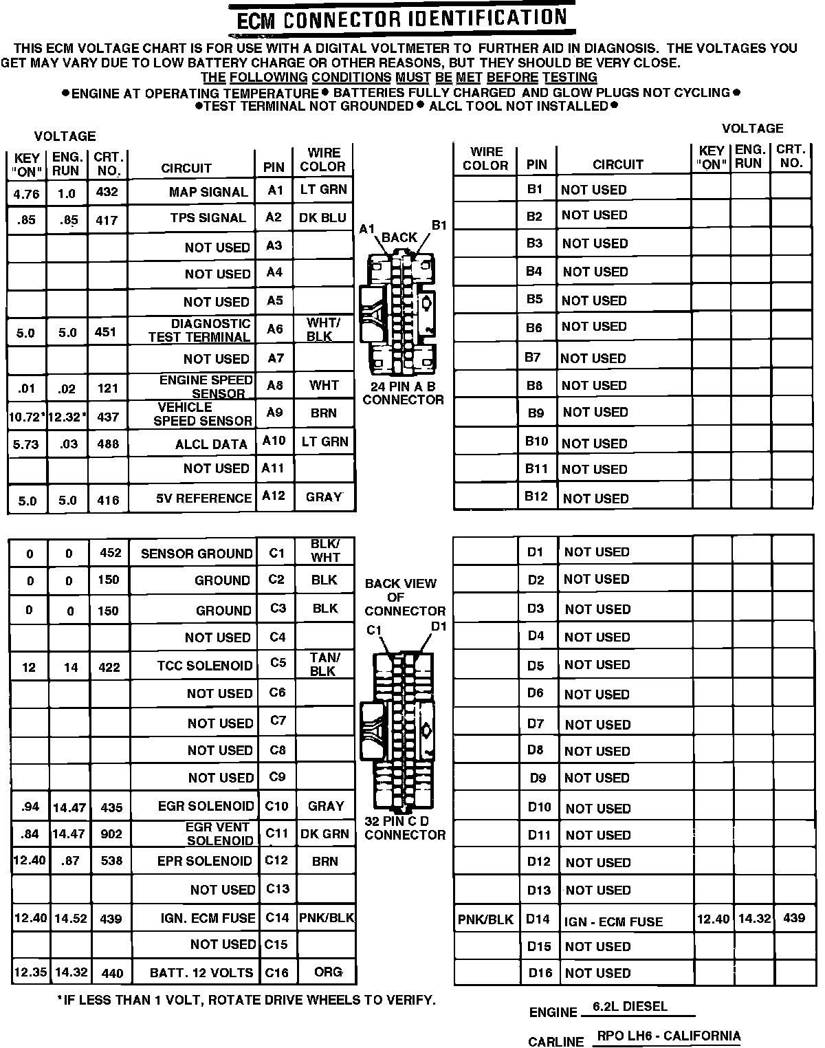 Fig. 20 ECM connector terminal identification & voltage specifications. 1985: