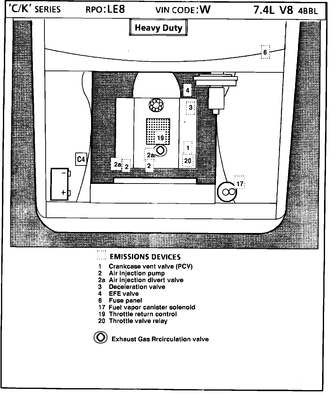 Fig. 120 Emission components locations. 1985-86 V8-454 4 Bbl. C & K Series heavy duty emissions: