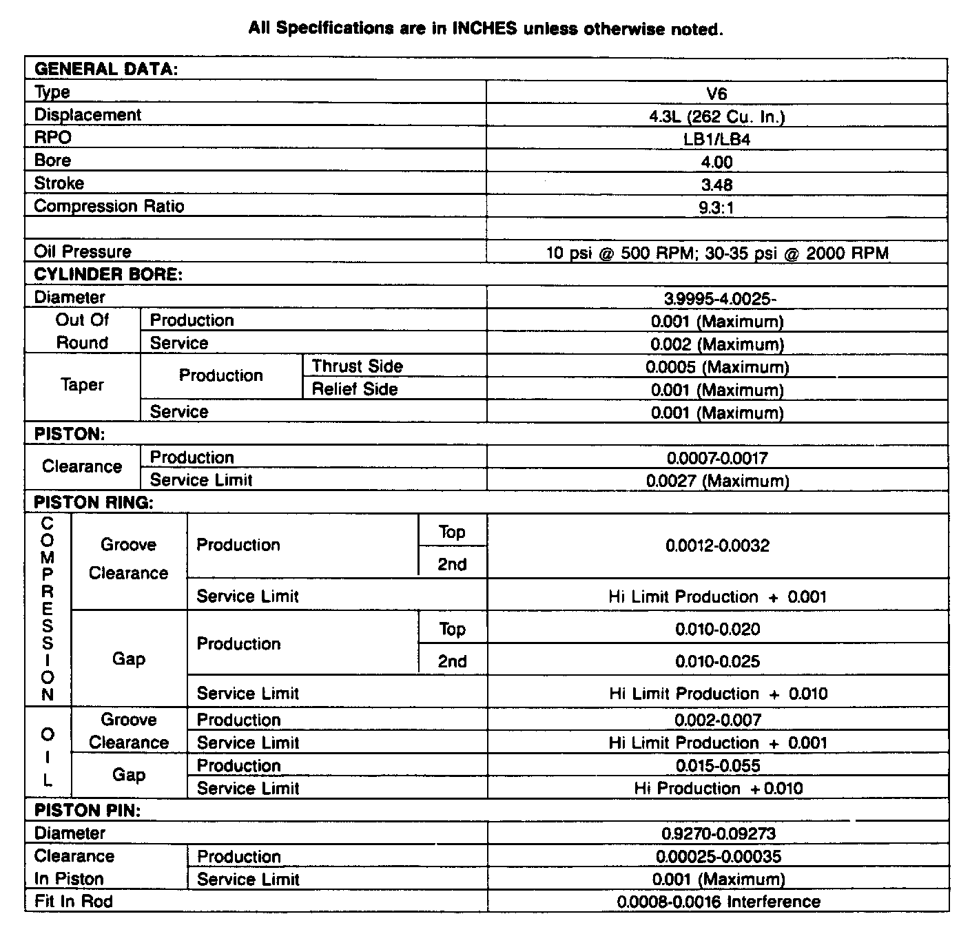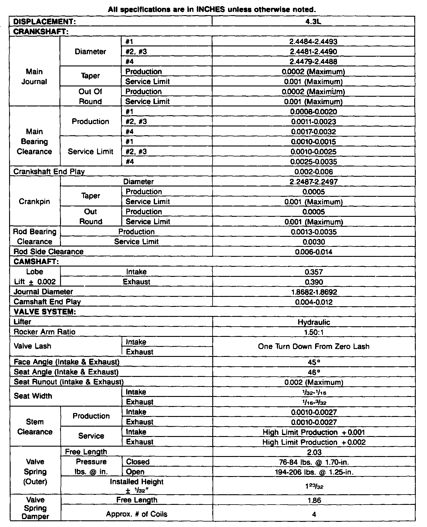 Engine Specifications (INCHES):