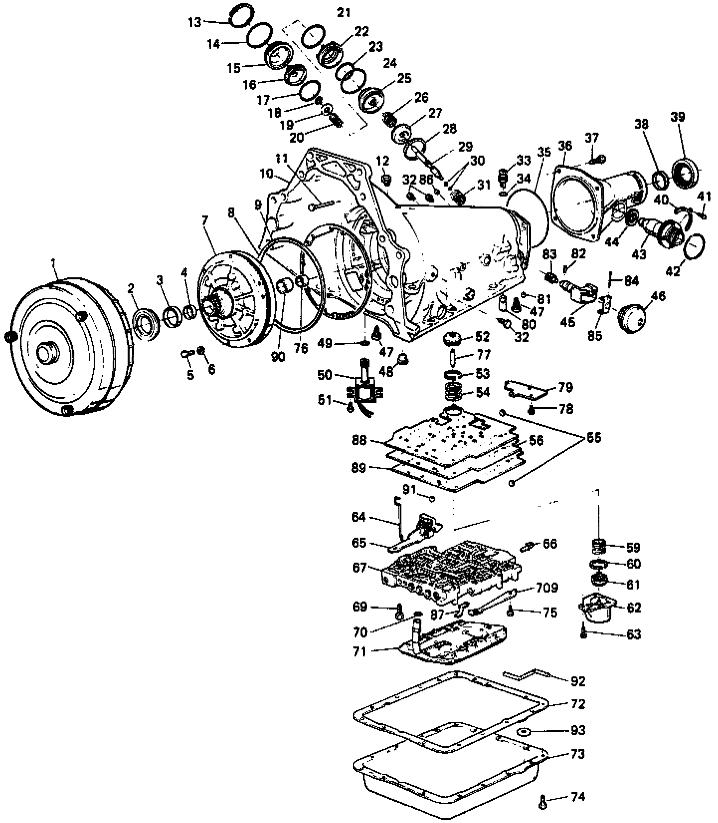 Refer to the "Service Bulletins" section prior to performing the following procedures.Fig. 1, Transmission case & external parts exploded view (Part 1 of 2). 1986 Models: