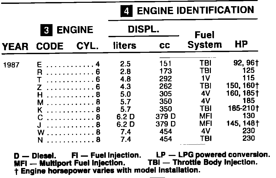 4 - ENGINE IDENTIFICATION: On the line where the engine code appears, read to the right to identify the engine.